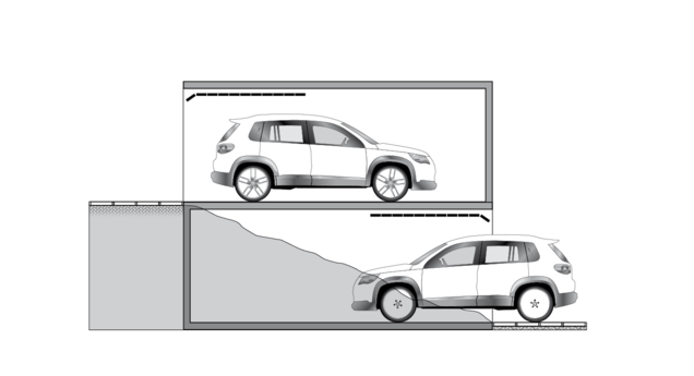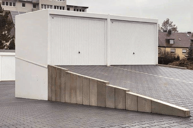 Eine weitere Variante für derartige Grundstücke sind Doppelstock-Garagen. Bei diesem Garagentyp ist die Zufahrt zur Garage über zwei Ebenen möglich.