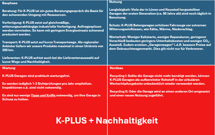 Auf den ersten Blick scheinen Fertiggaragen aus Beton auf Grund des Werkstoffes nicht in die engere Auswahl der klimafreundlichen Bauprodukte zu gehören. Obwohl Beton aus natürlichen Stoffen wie Sand, Kies und Wasser besteht, wird das Bindemittel Zement kritisch gesehen. Um Zement herzustellen wird viel Energie benötigt, die zur Zeit meist noch aus fossilen Brennstoffen erzeugt wird.