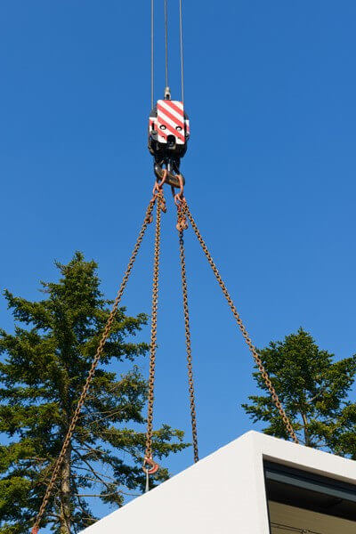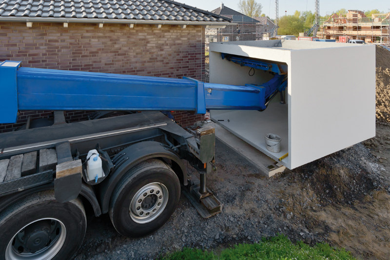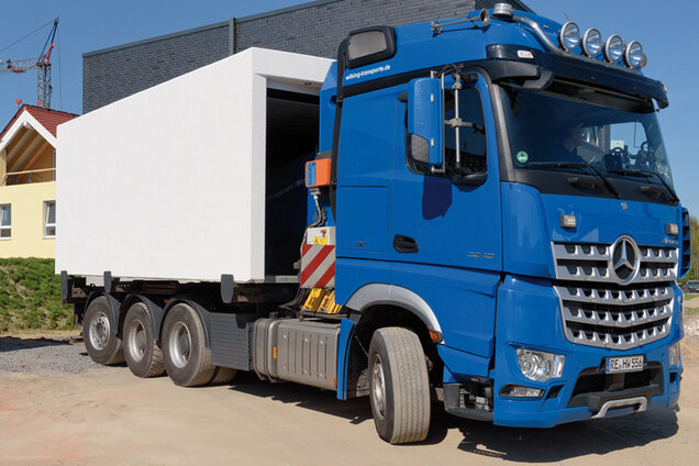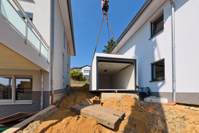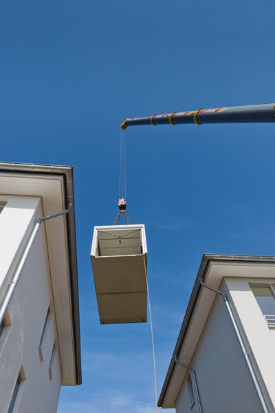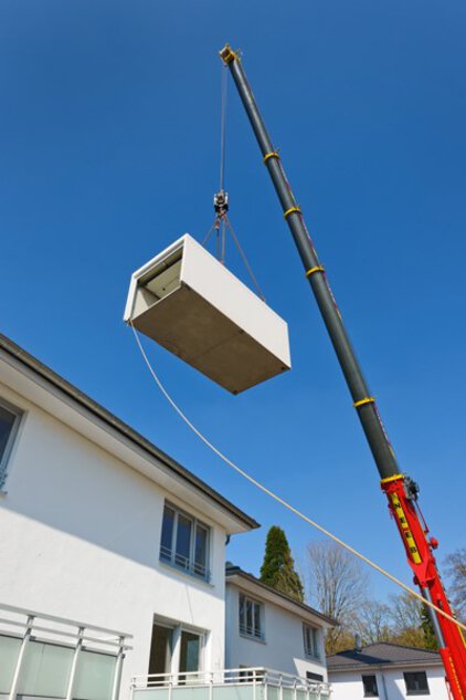 Bei einer beengten Baustelle oder einer nicht schwerlasttauglichen Zuwegung kann eine Garage auch mittels Mobilkran gesetzt werden. Speziell geschultes Personal führt diese Aufgabe mit größter Sorgfalt aus. Der Mobilkran muss gesondert bestellt werden.
